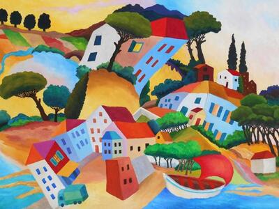Είναι τόποι μνήμης από τη ζωή μου και την πόλη μου, με μια ιδιαίτερη «γλώσσα» και «γραμματική» στην έκφραση. Θα έλεγα πως ο θεατής βλέπει διάφορα παιχνίδια, παραμορφώσεις και περίεργες προοπτικές καθώς το αποτέλεσμα είναι ονειρικό και σουρεάλ. Δεν έχουν μπει τίτλοι για να εισπράξει ο καθένας ό,τι θέλει από τα έργα. Εγώ άλλωστε δεν ζωγραφίζω με συγκεκριμένη πρόθεση, λειτουργώ μέσα σε ένα πήγαιν’ έλα ιδεών και δουλεύω εντελώς συνειρμικά.