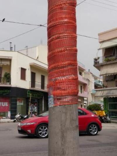 Καλή ώρα αυτή στην οδό Γούναρη, στου «Τσολιά». Η λύση εξαιρετική. Διπλώθηκε με ειδικό πλαστικό πλέγμα ώστε να μην πέφτουν κομμάτια τσιμέντου στα κεφάλια των περαστικών.