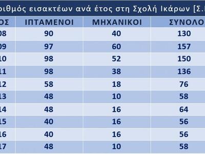 Το 2011 δεύτερο έτος εφαρμογής του Μνημονίου 1 (Μάϊος 2010) οι θέσεις εισακτέων στους Μηχανικούς ήταν λιγότερες κατά 14 (μείωση 26,92%). Το 2012 έτος υπογραφής και εφαρμογής του Μνημονίου 2 (Φεβρουάριος 2012) η Σχολή Ικάρων [Σ.Ι.] υπέστη τη μεγαλύτερη πτώση εισακτέων. Οι θέσεις στους Ιπτάμενους από 98 το 2011 μειώθηκαν στους 58, δηλαδή 40 λιγότεροι (μείωση 40,82%), ενώ στους Μηχανικούς σε συνέχεια με το 2011 μειώθηκαν ακόμα 20 θέσεις (μείωση 52,63%). Συνολικά στις δυο ειδικότητες εισήχθησαν 60 λιγότεροι (μείωση 44,12%). Το 2013 στους Μηχανικούς δόθηκαν μόνο 10 θέσεις (τις λιγότερες της δεκαετίας μαζί με το 2017). Το 2015 που υπογράφηκε το Μνημόνιο 3 (Αύγουστος 2015) οι θέσεις των εισακτέων στη Σ.Ι μειώθηκαν ακόμα περισσότερο. Από τις 58 το 2012 στις 40 για τους Ιπτάμενους και μόνο 16 για τους Μηχανικούς (συνολική μείωση 26,32%). Το 2015 οι Σ.Ι. δέχτηκε μόνο 40 Ιπτάμενους, 58 λιγότερους σε σχέση με το 2010 (μείωση 59,18%). Το 2017, 8η μνημονιακή χρονιά στη Σ.Ι., οι προσφερόμενες θέσεις ήταν μόνο 58, (48 Ιπτάμενοι και 10 Μηχανικοί), δηλαδή 92 λιγότεροι εισακτέοι από το 2010 (μείωση 61,33%) που πρωτοεφαρμόστηκε Μνημόνιο στην Ελλάδα. Νούμερα - ποσοστά που ζαλίζουν αλλά και περιγράφουν με τον καλύτερο τρόπο την αποστελέχωση της Σχολής Ικάρων.