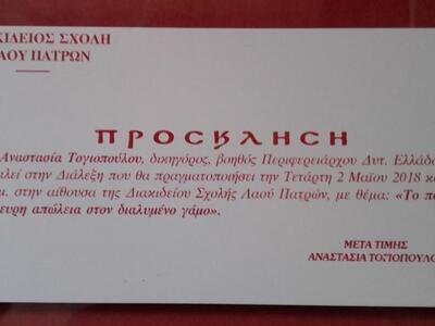 Στο βήμα του ιστορικού, πνευματικού σωματείου της Διακιδείου Σχολής του Λαού στην οδό Κανάρη 58, στην Πάτρα θα ανέβει την Τετάρτη 2 Μαΐου 2018, η δικηγόρος Αναστασία Τογιοπούλου.