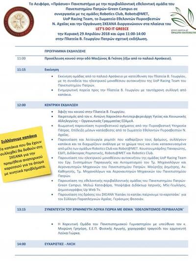 Την Κυριακή 29 Απριλίου η περιβαλλοντική εθελοντική ομάδα του Πανεπιστημίου Πατρών- Green Campus σε συνεργασία με τις ομάδες Robotics Club, Robots@MET, UoP Racing Team, το Σωματείο Εθελοντών Πυροσβεστών Ν. Αχαΐας και την Οργάνωση ΣΚΕΑΝΑ, διοργανώνουν εκδήλωση στο πλαίσιο του Let’s do it Greece, στην Πλ. Γεωργίου Α’, από τις 11:00 έως 14:00 το μεσημέρι.