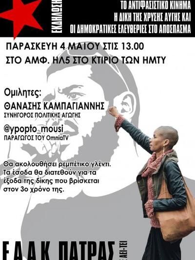 Την Παρασκευή 4/05 και ώρα 13:00 στο Πανεπιστήμιο Πατρών (στο ΑΜΦ. ΗΛ5 ΗΜΤΥ) τα ΕΑΑΚ Πάτρας διοργανώνουν συζήτηση με τους Θανάση Καμπαγιάννη (συνήγορο της πολιτικής αγωγής) και τον @ypopto_mousi (παραγωγό του OmniaTV) για το αντιφασιστικό κίνημα, την δίκη της Χρυσής Αυγής και τις δημοκρατικές ελευθερίες. Σε ανακοίνωση των ΕΑΑΚ Πάτρας αναφέρονται τα εξής: