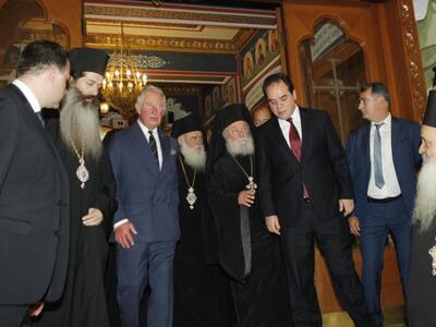 Υπό αυστηρά μέτρα προστασίας πραγματοποιήθηκε η ημίωρη συνάντηση του πρίγκιπα της Ουαλίας Καρόλου με τον Αρχιεπίσκοπο Αθηνών και πάσης Ελλάδος Ιερώνυμο στην Αρχιεπισκοπή Αθηνών.