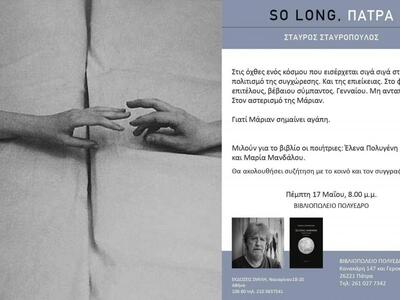 Το Πολύεδρο και οι εκδόσεις Σμίλη, παρουσιάζουν σε εκδήλωση που θα γίνει αυτή την Πέμπτη 17 Μαΐου 2018, στις 20. 00 το βράδυ, το βιβλίο του Σταύρου Σταυρόπουλου με τίτλο «So Long, Marianne, ποιήματα στη Μαρία».