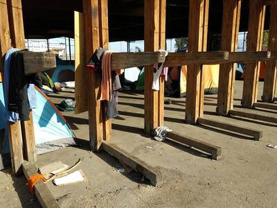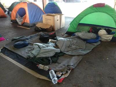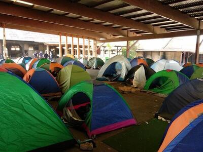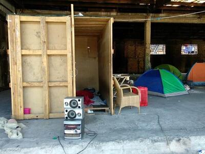Στο χώρο της ΑΒΕΞ οι μετανάστες είχαν στήσει τρία διαφορετικά μπλοκ με σύνολο 289 σκηνές. Σε κάθε ένα από αυτά, ξεχώριζε μια ξυλοκατασκευή στην οποία είχε τοποθετηθεί στρώμα, υπήρχαν καθρέπτες και ένα πολύμπριζο γεμάτο φορτιστές κινητών τηλεφώνων. Πιθανόν ανήκε στον «αρχηγό» κάθε ομάδας που «εξυπηρετούσε» τους υπόλοιπους στην παροχή ρεύματος ή άλλων ειδών πρώτης ανάγκης.
