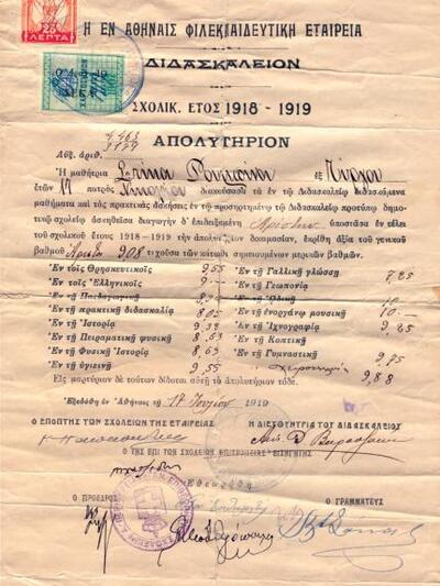 Απολυτήριο του «εν Πάτραις Αρσακείου Παρθεναγωγείου» έτους 1902. Έχει εκδοθεί στην Αθήνα µε ηµεροµηνία 22.07.1902 και υπογράφεται από τον Πρόεδρο και τον Γραµµατέα της Φιλεκπαιδευτικής Εταιρίας.