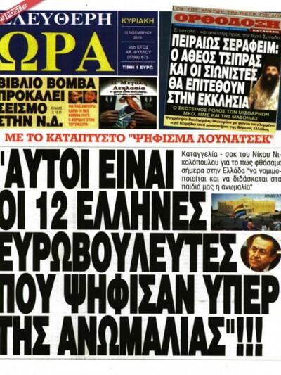Το παρακάτω πρωτοσέλιδο είναι αυτό που προκάλεσε την άρση ασυλίας του Αχαιού βουλευτή Νίκου Νικολόπουλου. Η μήνυση κατά του κ. Νικολόπουλου έγινε από το Ελληνικό Παρατηρητήριο των Συμφωνιών του Ελσίνκι, εκπρόσωπος του οποίου είναι ο κ. Παναγιώτης Δημητράς.