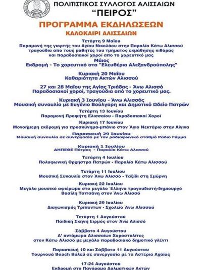 Ένα πλούσιο σε πολιτιστικές εκδηλώσεις καλοκαίρι, αναμένεται τοφετινό για τον Άνω και Κάτω Αλισσό. Ο Πολιτιστικός Σύλλογος Αλισσαίων "Πείρος" έχει προγραμματίζει σειρά εκδηλώσεων. Από αυτές ξεχωρίζει το αντάμωμα των απανταχού Αλισσαίων στις 8 Αυγούστου.