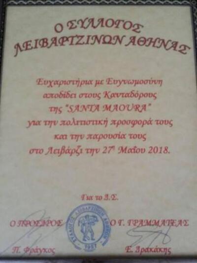 Ο Σύλλογός Λευκάδιων, ευχαριστεί από καρδιάς τον Σύλλογο και το Δ.Σ. των εν Αθήναις Λειβαρτζινών ,τόσο για την ευγενική τους πρόταση όσο και το όλο έργο τους ,το οποίο εμπλούτισαν με την ίδρυση του Λαογραφικού Μουσείου στο Λειβάρτζι .Ειδικότερα τον τον ακούραστο πρόεδρο κ Φράγκο Παναγιώτη για την πολυετή και συνεχή Προσφορά του στο Λειβάρτζι Καλαβρύτων και για την Προσφορά του στη διατήρηση και Προώθηση της Πολιτιστικής κληρονομιάς του τόπου του !