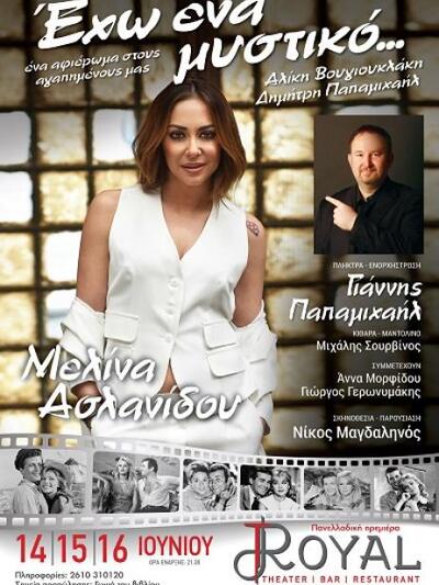 Στη θεατρική σκηνή του Royal με τρεις παραστάσεις καλούμαστε να θυμηθούμε και να ονειρευτούμε, τραγουδώντας τα κινηματογραφικά τραγούδια «Καροτσέρη», «Εχω ένα μυστικό», «Σήκω χόρεψε συρτάκι», «Μάτια βουρκωμένα» και άλλα άσματα που άφησαν εποχή και μεγάλωσαν γενιές και γενιές. Ενορχηστρωτής δεν είναι άλλος από το Γιάννη Παπαμιχαήλ, που θα παίζει ζωντανά επί σκηνής πιάνο συνθεσάιζερ και έχει την ευθύνη της επιλογής των τραγουδιών. Όπως αναφέρει ο ίδιος, κάποτε του αφιέρωσε η Αλίκη το τραγούδι «Νανούρισμα» και ήρθε η ώρα να το ανταποδώσει. Μαζί του η αγαπημένη ερμηνεύτρια Μελίνα Ασλανίδου με τη μαγική της φωνή αλλά και ο κορυφαίος κιθαρίστας Μιχάλης Σορβίνος, η σπουδαία σοπράνο Άννα Μορφίδου και ο ταλαντούχος Γιώργος Γερωνυμάκης. Παράλληλα με τα τραγούδια θα προβάλλονται πασίγνωστες σκηνές από τις ταινίες της Αλίκης και του Δημήτρη.