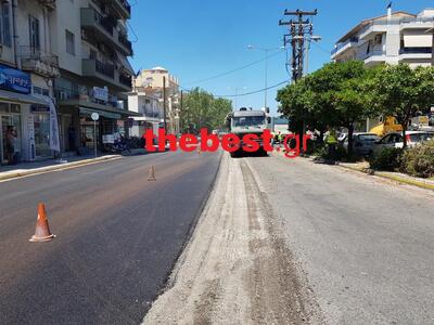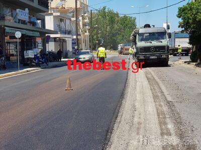 Στο σημείο επιχειρούν, ένα ειδικό όχηματα απόξυσης του ασφαλτοτάπητα, φορτηγά οχήματα, οδοστρωτήρας και ασφαλτικό.