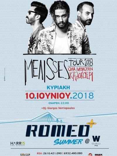 Eνα εκρηκτικό live υπόσχεται το δημοφιλές συγκρότημα Melisses αυτή την Κυριακή 10 Ιουνίου στη νέα «έδρα» του Romeo, στο W της παραλιακής του Ρίου, με διοργανωτή τον αγαπητό party expert Χάρη Παναγόπουλο της εταιρείας εκδηλώσεων Harris the Events. «Όλα μοιάζουν καλοκαίρι» τιτλοφορείται η θερινή περιοδεία του περιζήτητου γκρουπ και βέβαια η Πάτρα αποτελεί κορυφαίο σταθμό της, αφού πάντα ο Χρήστος Μάστορας και η παρέα του προκαλούν απίστευτο κέφι και κοσμοπλημμύρα. (Προβλέπεται σας λέμε φοβερό και τρομερό ξενύχτι, πέρυσι είχε γίνει «χαμός» ως τις 4 το πρωί!)