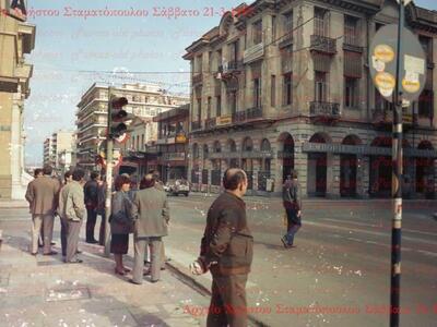 Κορίνθου και Γούναρη στο κέντρο της Πάτρας Σάββατο 21-3-1987, στην γωνία συνδικαλιστές κουβεντιάζουν, ένας περαστικός έχοντας κάνει τα ψώνια του από τον Μουστάκη προσπαθεί να περάσει απένταντι με τον τροχονόμο (Μπαξεβάνης;;;) ίσα ίσα να φαίνεται πάνω από τον ώμο του ενώ πίσω του δεσπόζει το όμορφο κτήριο με τις φθορές και τα σημάδια του χρόνου κάτι παραπάνω από ορατά.