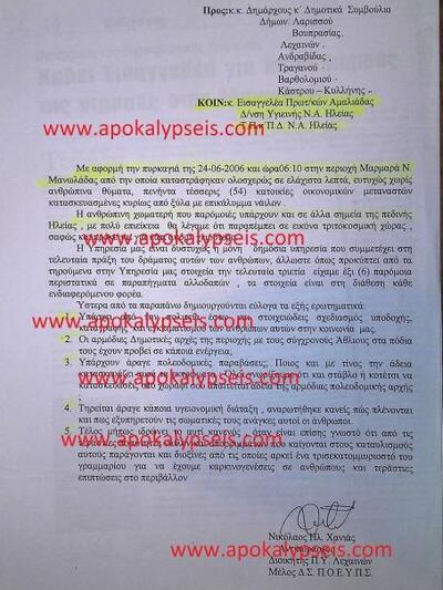 Το www.apokalypseis.com φέρνει στο φως της δημοσιότητας την επιστολή αγωνίας προς τις δικαστικές Αρχές της Αμαλιάδας και στις άλλες αρμόδιες υπηρεσίες, του αξιωματικού της Πυροσβεστικής Υπηρεσίας Νικολάου Χανιά, για τους καταυλισμούς της ντροπής στην Νέα Μανωλάδα Ηλείας .