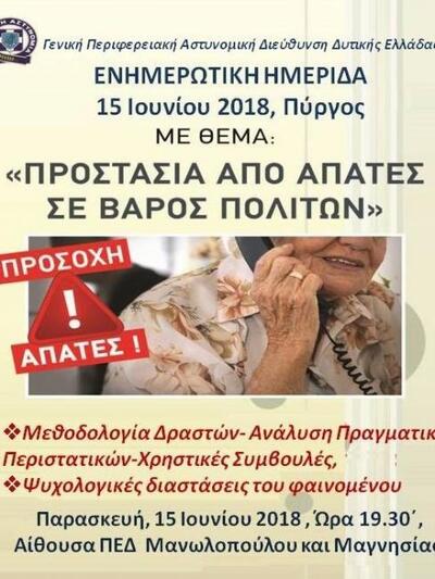 Την Παρασκευή (15-06-2018) στις 19:30 το απόγευμα, στην αίθουσα της Περιφερειακής Ένωσης Δήμων (παράρτημα Πύργου – οδός Μανωλοπούλου και Μαγνησίας), η Γενική Περιφερειακή Αστυνομική Διεύθυνση Δυτικής Ελλάδας, θα πραγματοποιήσει ενημερωτική ημερίδα, με θέμα :
