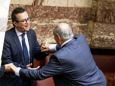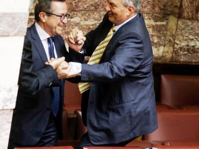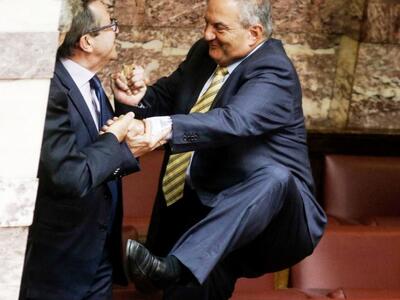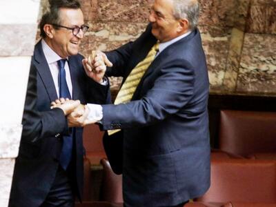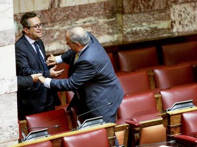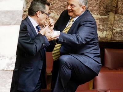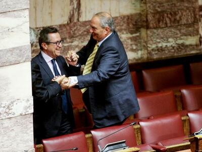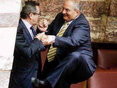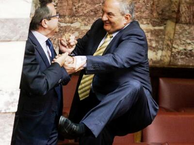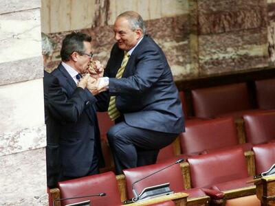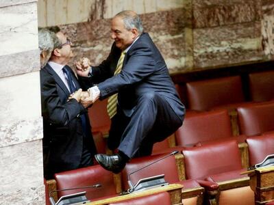 Τον πρώην πρωθυπουργό Κώστα Καραμανλή συνέλαβε ο φωτογραφικός φακός στη Βουλή την ώρα που σκαρφάλωνε τα έδρανα για να πλησιάσει τον ανεξάρτητο βουλευτή Αχαΐας Νίκο Νικολόπουλο στα «ορεινά» του κοινοβουλίου. Όλα αυτά συνέβησαν το μεσημέρι της Πέμπτης μετά την ολοκλήρωση της ψηφοφορίας του πολυνομοσχεδίου και εν αναμονή της έναρξης της συζήτησης της πρότασης μομφής που κατέθεσε η ΝΔ.