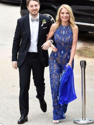 Ο γαμπρός έφτασε στην εκκλησία συνοδευόμενος από την απαστράπτουσα μητέρα του. Η Έλλη Στάη επέλεξε μια μπλε ολόσωμη φόρμα που τόνιζε την καλλίγραμμη σιλουέτα της.