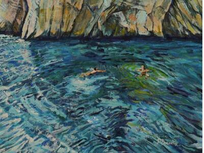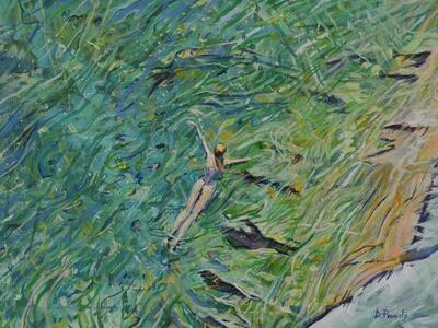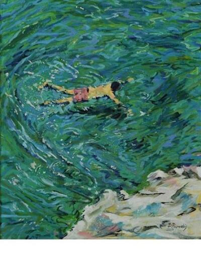 Σαν να παρατηρούμε από ψηλά κάποιον που χαλαρώνει ή κολυμπά και να θέλουμε να βρεθούμε στην θέση του. Επίσης με ενδιαφέρει η εικαστική απόδοση του υγρού στοιχείου και οι αντανακλάσεις που δημιουργούνται που πάντα είναι διαφορετικές. Έχοντας στο μυαλό μου τους μεγάλους δάσκαλους της ζωγραφικής προσπαθώ να αποδώσω τα στοιχεία αυτά με ένα σύγχρονο τρόπο».