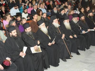 Διακρίνονται ο Μακαριώτατος Αρχιεπίσκοπος Αθηνών και Πάσης Ελλάδος κ.κ. Ιερώνυμος να απονέμει το βραβείο στη διευθύντρια της Χορωδίας, Ελένη Παπαδοπούλου- Αραβαντινού, ο Σεβασμιώτατος Μητροπολίτης Πατρών κ.κ. Χρυσόστομος και λοιποί Ιεράρχες και η Παιδική Χορωδία της ΠΟΛΥΦΩΝΙΚΗΣ ερμηνεύοντας παραδοσιακά κάλαντα, κατά τη διάρκεια της τελετής, στο Στάδιο Ειρήνης και Φιλίας- αίθουσα ''Μελίνα Μερκούρη'' [28.12.10].