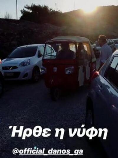 Η νύφη έφτασε στην εκκλησία με vintage τρίκυκλο μηχανάκι το οποίο οδηγούσε ο Γιώργος Αγγελόπουλος που είναι φίλος του γαμπρού.