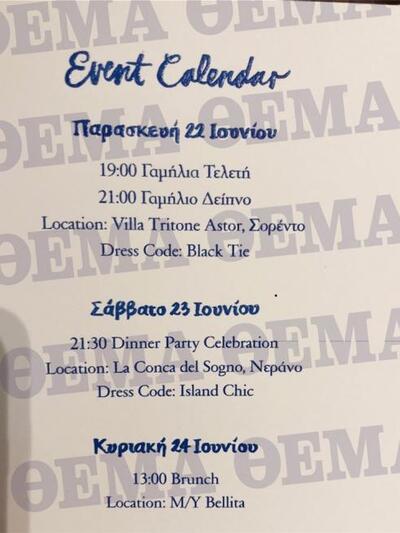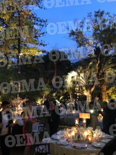 Φυσικά, μετά την ολοκλήρωση της γαμήλιας τελετής ακολούθησε δείπνο παρουσία 200 καλεσμένων, συγγενών και φίλων του ζευγαριού από τον εφοπλιστικό χώρο και το εξωτερικό, σε μία μαγική τοποθεσία, τους κήπους της παραμυθένιας βίλας Τritone στο Σορέντο, που έχουν θέα τις δαντελωτές ακρογιαλιές.
