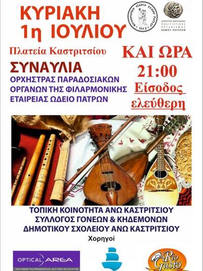 Βραδιά παραδοσιακής μουσικής πραγματοποιείται απόψε στο Άνω Καστρίτσι Πατρών. Η Ορχήστρα Παραδοσιακών Οργάνων της Φιλαρμονικής Εταιρείας Ωδείου Πατρών δίνει συναυλία στις 9 μ.μ. στην πλατεία.