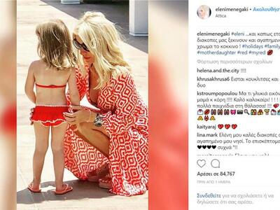 Η Ελένη Μενεγάκη ανέβασε μία φωτογραφία μαζί με την μικρή της κόρη, έτοιμες για παραλία. Η μικρούλα, φορά ένα κατακόκκινο μπικίνι, και η Ελένη ένα μακρύ φόρεμα με λευκά και κόκκινα μοτίβα.