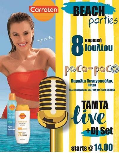 Eνα απόλυτα καλοκαιρινό συναπάντημα, το Carroten Βeach Party με πρωταγωνίστρια την εντυπωσιακή ποπ ερμηνεύτρια Τάμτα, αναμένεται αυτή την Κυριακή 8 Ιουλίου στο παραλιακό Poco Poco της Παναγοπούλας. Mετά την περσινή επιτυχία στο ίδιο μέρος, η περιζήτητη τραγουδίστρια, performer και fashion icon επιστρέφει στα μέρη μας με την επικοινωνιακή και οργανωτική σφραγίδα του Χάρη Παναγόπουλου και της εταιρείας Harris the Events. Πάντα λαμπερή και στυλιστικά μοναδική, η 36χρονη γεωργιανή υπόσχεται ένα εκρηκτικό live δίπλα στο κύμα ενώ τριγύρω θα λικνίζονται ηλιοκαμένα κορμιά και καυτά μπικίνι.