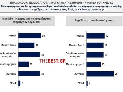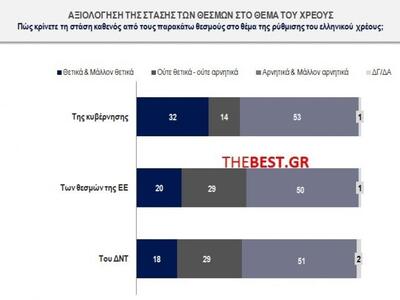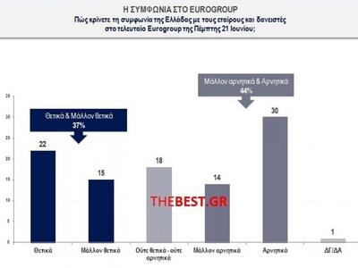 Το 37% κρίνει θετικά και μάλλον θετικά τη συμφωνία στο Eurogroup ενώ το 44% αρνητικά και μάλλον αρνητικά. Θετικά και μάλλον θετικά κρίνει τη συμφωνία για το Σκοπιανό το 37%, ενώ αρνητικά και μάλλον αρνητικά το 55%. Μάλιστα το 39% θεωρεί ότι πρέπει να επικυρωθεί η συμφωνία από τη Βουλή, ενώ το 57% να μην επικυρωθεί.