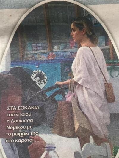 Η ξανθιά παρουσιάστρια, χωρίς ίχνος μακιγιάζ, με τα μαλλιά πιασμένα αλλά πάντα κομψά ντυμένη και κατάλληλα για την περίσταση. Μαζί της είχε τον μικρό Σάββα στο καρότσι του και έκανε τα ψώνια της και ύστερα μια μικρή βόλτα στα σοκάκια του νησιού για να συναντήσει και πάλι την οικογένεια του συζύγου της.