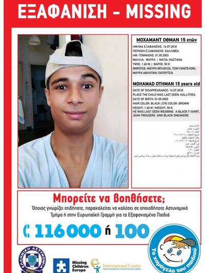 Ένας 15χρονος με καταγωγή από τη Συρία, εξαφανίστηκε από το σπίτι του στην Καλλιθέα Αττικής από τις 16 Ιουλίου. Έκτοτε ο Μοχάμαντ δεν έχει δώσει σημεία ζωής.