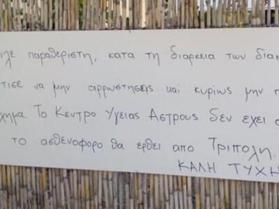 Εμβρόντητοι έμεινα οι λουόμενοι στο Παράλιο Άστρος της Αρκαδίας όταν είδαν αυτό το μήνυμα σε κεντρικό σημείο της κωμόπολης. Κι αυτό γιατί συμβουλεύει τον παραθεριστή να… μην αρρωστήσει, καθώς δεν υπάρχει οδηγός στο κέντρο υγείας του Αστρους.