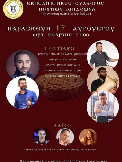 Ο Εκπολιτιστικός Σύλλογος Ποντίων Απιδεώνα Αχαΐας διοργανώνει όπως είδαμε ένα Ποντιακό και λαϊκό γλέντι αυτή την Παρασκευή 17 Αυγούστου 2018 στις 21:00 το βράδυ στην κεντρική πλατεία Απιδεώνα που βρίσκεται λίγο πιο πάνω από το Λάππα Αχαΐας.
