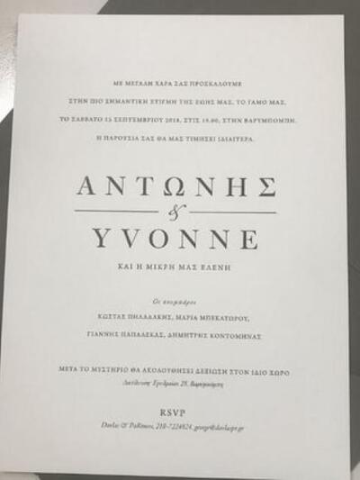 «Με μεγάλη χαρά σας προσκαλούμε στην πιο σημαντική στιγμή της ζωής μας, το γάμο μας, το Σάββατο 15 Σεπτεμβρίου 2018, στις 19.00, στην Βαρυπόμπη. Η παρουσία σας θα μας τιμήσει ιδιαίτερα» διαβάζουμε στο προσκλητήριο στο οποίο διακρίνουμε τρεις "υπογραφές": Αντώνης, Yvonne & η μικρή Ελένη.