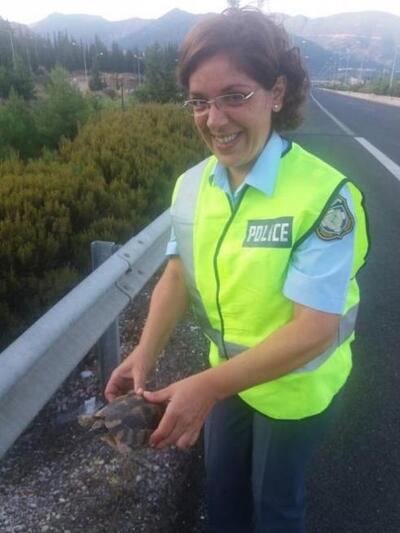 Αστυνομικοί της τροχαίας αυτοκινητοδρόμων, κατά τη διάρκεια περιπολίας τους στην ΝΕΟ Πατρών Κορίνθου, εντόπισαν μια χελώνα να κινείται στη μέση του δρόμου. Αμέσως κινήθηκαν προς το μέρος της, την σήκωσαν από το οδόστρωμα και την βοήθησαν να επιστρέψει στο φυσικό της περιβάλλον.