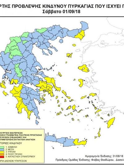 Σύμφωνα με πρόβλεψη της Γενικής Γραμματείας Πολιτικής Προστασίας, για αύριο Σάββατο 1 Σεπτεμβρίου 2018, περιοχές της Δυτικής Ελλάδας, βρίσκονται στην κατηγορία κινδύνου 3, όπως φαίνεται στον επισυναπτόμενο ημερήσιο Χάρτη Πρόβλεψης Κινδύνου Πυρκαγιάς. "Για το λόγο αυτό, οι πολίτες πρέπει να αποφεύγουν εργασίες και ενέργειες που μπορεί να προκαλέσουν πυρκαγιά από αμέλεια, όπως ρίψη αναμμένου τσιγάρου, καύση υπολειμμάτων καλλιεργειών, χρήση μηχανημάτων τα οποία υπάρχει πιθανότητα να προκαλέσουν σπινθήρα, χρήση υπαίθριων ψησταριών κ.ά.", αναφέρει σε ανακοίνωσή της η Περιφέρεια Δυτικής Ελλάδας και συνεχίζει: