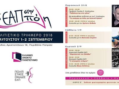 Οι εκδηλώσεις  Πολιτιστικού Τριημέρου με την Προβολή της Ταινίας "Πεθαίνοντας στο γέλιο" του Στέλιου Κούλογλου στο Αίθριο Β' στις εγκαταστάσεις του ΕΑΠ στην Πάτρα.