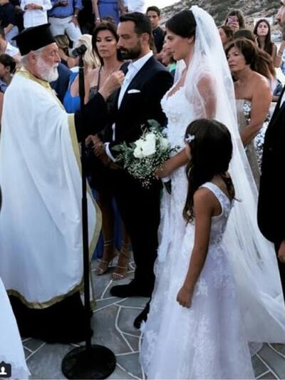 Η νύφη έφτασε με φουσκωτό σκαφάκι στο εκκλησάκι όπου την συνόδευε ο πατέρας της, παραδίδοντάς την στον γαμπρό. Ο Σάκης Τανιμανίδης την πλησίασε, της έδωσε ένα τρυφερό φιλί και οι καλεσμένοι τους καταχειροκρότησαν.