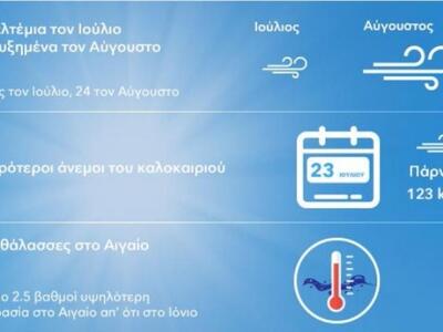 - Λίγα μελτέμια τον Ιούλιο, αλλά πολύ αυξημένα τον Αύγουστο: Εντυπωσιακά χαμηλός ήταν ο αριθμός των ημερών με ισχυρούς βόρειους άνεμους στο Αιγαίο τον Ιούλιο, με μόνο οκτώ ημέρες, ο μικρότερος αριθμός ημερών κατά τα τελευταία δέκα χρόνια. Αντιθέτως ο φετινός Αύγουστος ήταν μήνας με μεγάλη συχνότητα ισχυρών βόρειων ανέμων (24 ημέρες μελτεμιών).