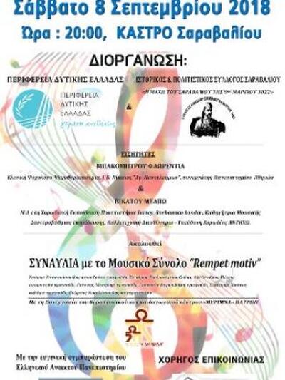 Η Περιφέρεια Δυτικής Ελλάδας και ο Ιστορικός και Πολιτιστικός Σύλλογος Σαραβαλίου, διοργανώνουν το Σάββατο 8 Σεπτεμβρίου 2018 και ώρα 20:00, στο Κάστρο του Σαραβαλίου, επιστημονική ημερίδα με τίτλο: «Η θεραπευτική σημασία της μουσικής στη ζωή μας».
