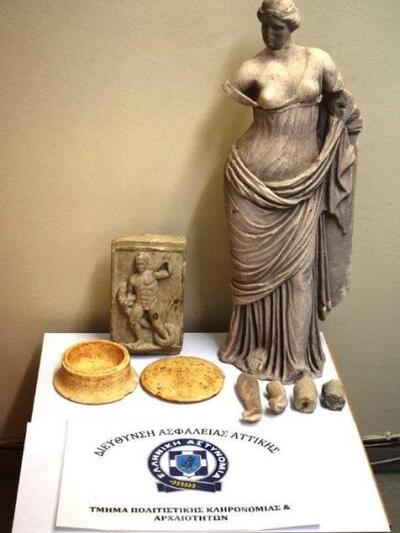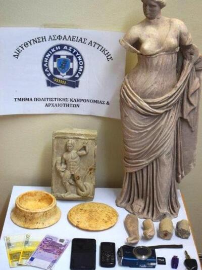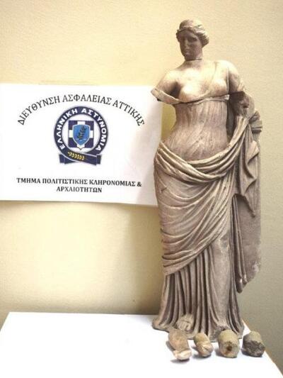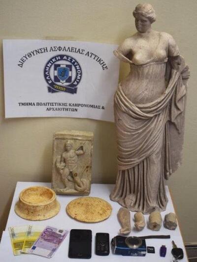 Παράλληλα ταυτοποιήθηκαν και αναζητούνται δύο συνεργοί του. Σημειώνεται, ότι μεταξύ των άλλων, ο συλληφθείς φέρεται να κατείχε μαρμάρινο γυναικείο άγαλμα της θεάς Αφροδίτης, που ακουμπάει σε πεσσό, φοράει χιτώνα και ιμάτιο, αποτελούμενο από 8 συνανήκοντα τμήματα, 2ου ή 1ου αιώνα π.Χ., συνολικού ύψους 80 εκατοστών. Όπως διαπιστώθηκε, το κατασχεθέν άγαλμα της θεάς Αφροδίτης, ρωμαϊκής εποχής, έχει αφαιρεθεί από το Μουσείο Προϊστορικής Θήρας στη Σαντορίνη, όπου φυλασσόταν στους αποθηκευτικούς χώρους του και αναγνωρίστηκε από την αρμόδια αρχαιολόγο της Εφορείας Αρχαιοτήτων Κυκλάδων και Προϊσταμένη του Μουσείου.