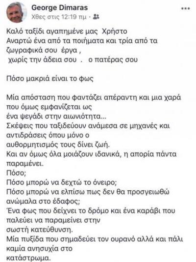 «Καλό ταξίδι αγαπημένε μας Χρήστο. Αναρτώ ένα από τα ποιήματα και τρία από τα ζωγραφικά σου έργα, χωρίς την άδεια σου. Ο πατέρας σου». Αυτό αναφέρει το κείμενο της ανάρτησης του πολιτικού στο Facebook για το γιό του, ο οποίος έφυγε από τη ζωή τα ξημερώματα της Παρασκευής.