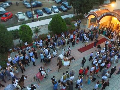 Και η νύφη έφτασε στην εκκλησία καβάλα στο άλογο συνοδευόμενη από τον πατέρα της και άλλους οργανοπαίχτες, όπου στην είσοδο έγινε η παράδοση στον γαμπρό.