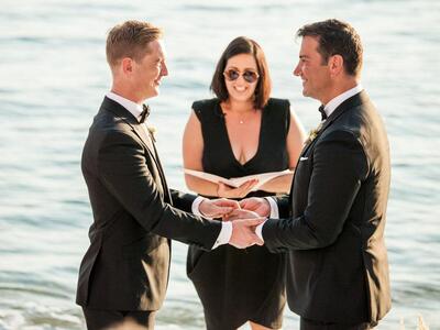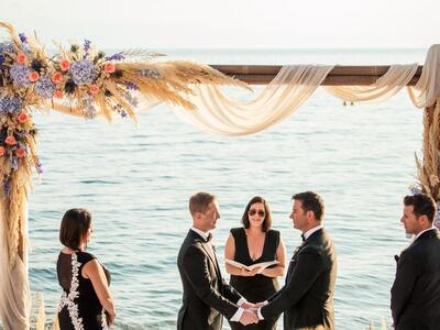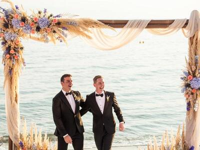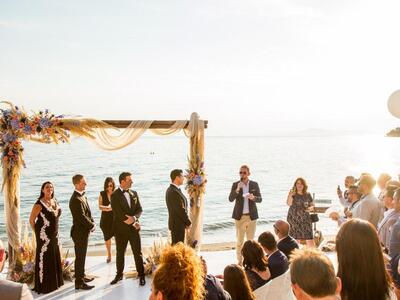 Μαζί τους δεκάδες συγγενείς, φίλοι και τουρίστες, οι οποίοι κατέγραφαν την τελετή με τις κάμερες των κινητών τους τηλεφώνων. Το ζευγάρι δημιουργησε ένα παραμυθένιο σκηνικό με λευκές, μπλε και μωβ αποχρώσεις, υπέροχες συνθέσεις λουλουδιών, ξύλινες λεπτομέρειες και πινελιές λινάτσας. Αφού αντάλλαξε όρκους μπροστά από μια ιδιαίτερη αψίδα, απόλαυσε ένα γευστικό γεύμα με τα αγαπημένα του πρόσωπα, γιορτάζοντας έτσι την αγάπη του.