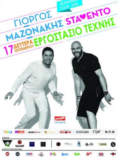 Στο πλαίσιο της από κοινού καλοκαιρινής τους περιοδείας, καταφθάνουν την προσεχή Δευτέρα 17 Σεπτεμβρίου 2018 στην Πάτρα, στον προαύλιο χώρο του Εργοστασίου τέχνης στην Ακτή Δυμαίων, πλάι στου Λαδόπουλου, ο Γιώργος Μαζωνάκης και ο Μιχάλης Κουινέλης των Stavento.