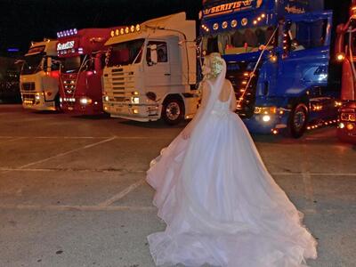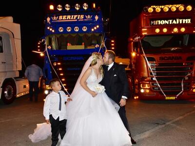 Οδηγός και ιδιοκτήτης νταλίκας, ο Δημήτρης αποφάσισε ο γάμος του να συνοδεύεται από τις κόρνες του αγαπημένου του οχήματος. Φίλοι και συνάδελφοι του γαμπρού συνόδευσαν υπό τους ήχους των τεράστιων φορτηγών το ζευγάρι στην εκκλησία και από εκεί στο λιμάνι για τις απαραίτητες φωτογραφίες.