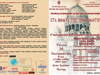 Στο πλαίσιο της 54ης επετείου της επανακομιδής της Τιμίας Κάρας του Αποστόλου Ανδρέου στην Πάτρα, προγραμματίζεται για την Τετάρτη 19 Σεπτεμβρίου 2018 στις 20.00 το βράδυ στον αύλειο χώρο μπροστά από το ναό του Πολιούχου Αγίου Ανδρέου, παραδοσιακή μουσικοχορευτική εκδήλωση με ελεύθερη μάλιστα είσοδο για το κοινό. Να σημειωθεί πως είναι η 3η χρονιά που διοργανώνεται παρόμοια εκδήλωση υπό την αιγίδα της Ιεράς Μητροπόλεως Πατρών.