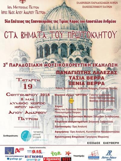 Ο Σεβασμιώτατος Μητροπολίτης Πατρών κ.κ. Χρυσόστομος, ο Προϊστάμενος του Ιερού Ναού Αγίου Ανδρέου Πατρών Πρωτοπρεσβύτερος Νικόλαος Σκιαδαρέσης, η Περιφέρεια Δυτικής Ελλάδας, ο Σύλλογος Ελληνικών Παραδοσιακών Χορών του Πανεπιστημίου Πατρών, οι Μουσικοί και οι Ερμηνευτές Ύμνων και Παραδοσιακών Τραγουδιών, προσκαλούν τον κόσμο για μια ακόμη χρονιά, να παρευρεθεί στην 3η μουσικοχορευτική εκδήλωση «Στα Βήματα του Πρωτοκλήτου» την Τετάρτη 19 Σεπτεμβρίου 2018, στις 8 μ.μ. ακριβώς, όπου μέσα από τη Μουσική μας Παράδοση, τον ποιητικό λόγο, την σύνθεση των ήχων, τον ρυθμό, και την έκφραση μέσω της κίνησης, θα αναδείξουν το μεγαλείο του Αποστολικού έργου του Αγίου Ανδρέου.