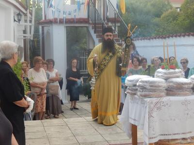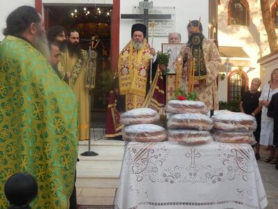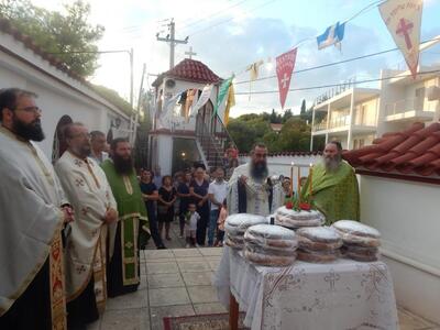 Στον πανηγυρικό εσπερινό μετ’ αρτοκλασίας παρέστη και χοροστάτησε ο Θεοφιλέστατος Επίσκοπος Κερνίτσης κ. Χρύσανθος, ο οποίος και μίλησε σχετικά με την μεγάλη εορτή και μέρα της Υψώσεως του Τιμίου Σταυρού του Ιησού Χριστού ενώ ευχήθηκε σε όλους ο Σταυρός να μας αγιάζει και να μας χαριτώνει. Ο Θεοφιλέστατος κ.κ. Χρύσανθος αναφέρθηκε στην εύρεση του Τιμίου Σταυρού υπό της Αγίας Ελένης και στις δύο Υψώσεις του που εορτάζονται την 14η Σεπτεμβρίου.