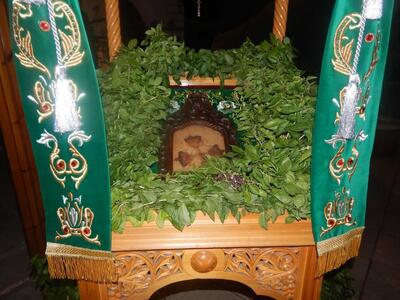 *Να προσθέσουμε πως η εικόνα με το σταυρόσχημο ξύλο είχε τοποθετηθεί σε ξύλινο θρόνο και ήταν γεμάτη από κλωνάρια μοσχομυριστό βασιλικό. Βασιλικός μοιράστηκε σε όλο τον κόσμο μαζί με τον άρτο.